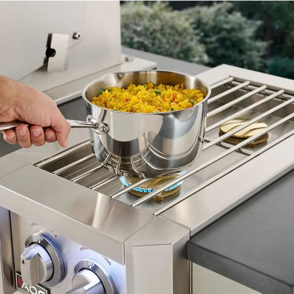 The L-Series American Outdoor Grill built-in side burner comes with control panel accent lighting and is constructed of stainless steel with two 12,500 BTU solid brass burners with adjustable heat control knobs. Adding a double side burner to your outdoor kitchen setup expands your cooking and provides a variety of food preparation options you would not have without one.