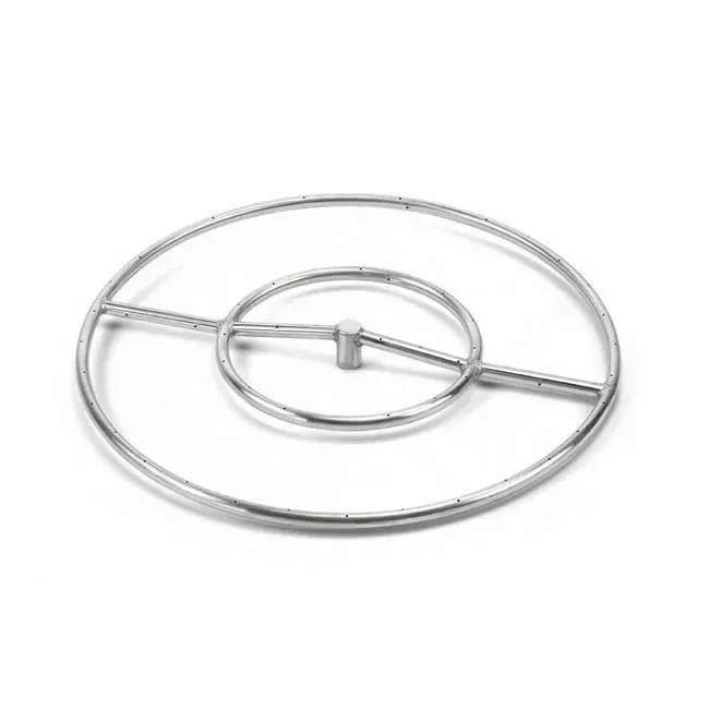 18 inch build your own outdoor gas fire pit with this stainless steel fire ring. Uniquely designed to keep water from collecting in the burner. All of our fire rings have staggered burner ports for a better flame pattern and a more significant flame presence with a raised center hub above concentric rings to reduce risk of water in valve or gas line. One of the best things about our fire rings is that we precision drill the holes in the burner and the competition punches their holes creating an inconsistent flame.