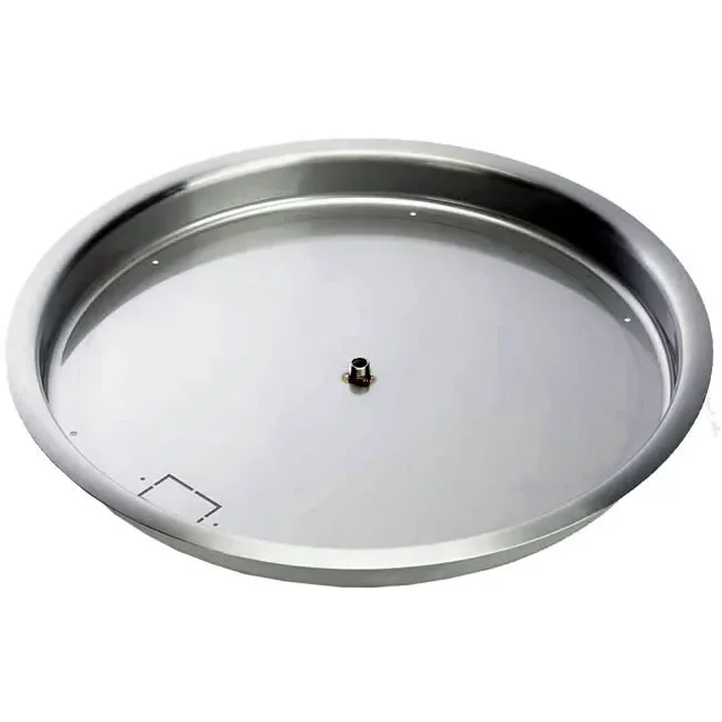 Our 43" high capacity round bowl style gas fire pit burner pan is made of 16 gauge 304 stainless steel and comes with a 3/4" stainless nipple welded in the center to connect gas supply to bottom side of pan and gas fire ring to top side of pan. All of our bowl style pans are 2-3/8" deep and have a 1-3/8" lip around the top so they can be set in a circular enclosure to support it. We also provide built-in water weep holes in the bottom for drainage. This pan is commonly used with our 36" gas fire ring.