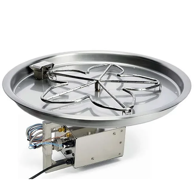 This large 43 inch diameter outdoor gas fire pit will make you want to shed layers of clothes even on the coldest nights. With 400K BTU of heat and the durability of this stainless steel constructed fire pit you will be very impressed to say the least. Comes fully assembled and ready to install into your non-combustible surround. The surround can be made of wall block, slate rock or any type of material that is fire proof. Available for natural gas or propane and with the simple push of a button or flip of a switch you will bring the fire. If you need help sizing your pit or any other questions give us a call.