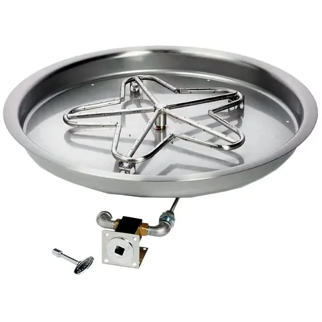 The match lit fire pit comes in four different sizes, 13", 19", 25" and 31" diameter. The solid 304 stainless steel construction will provide many years of enjoyment. Comes standard with the stainless steel bowl style burner pan, 36" whistle free flexible gas line from burner to control valve and Penta style burner with precision drilled holes unlike the competition as they punch their holes creating an inconsistent flame. We also offer optional high quality Flat Aluminum and Domed Aluminum covers to protect the fire pit from harsh weather. Our new Key Valve Mounting Bracket for mounting the gas control valve in the side of the surround is also available if needed. Need a Flexible Gas Supply Connector? We have them also. See more about burners below.