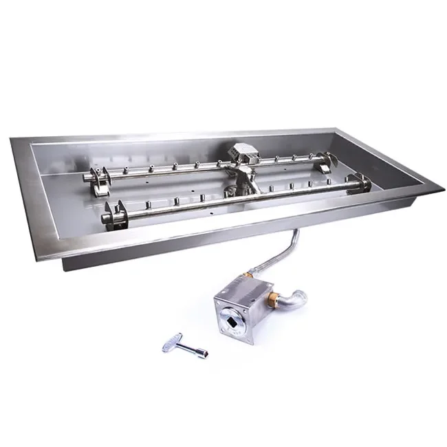 Our match lit rectangle fire pit inserts are offered in three different widths, 24", 30" and 36" wide. Comes standard with our stainless steel burner pan, 18 gauge stainless steel Torpedo style H-Burner and a 36" whistle free flexible gas line from burner to control valve for simple installation. Our patented Torpedo Style H-Burner are made from commercial grade 304 stainless steel and come standard with fuel efficient nozzles as well as hand welded burner nozzle components. With these features it allows the flame to burn both quiet and clean. See more about our H style burners below. Need a Flexible Gas Supply Connector? We have them also.