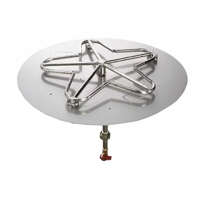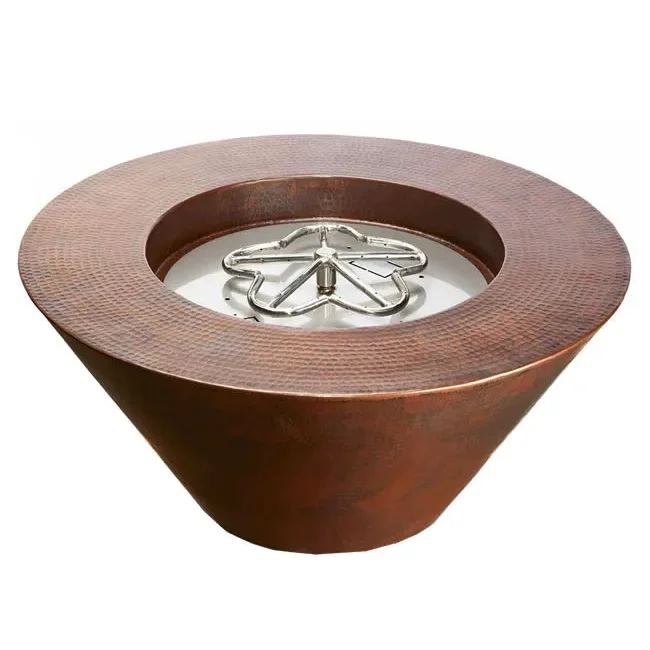 This is the manual control 32" round Mesa style hammered copper outdoor fire pit bowl that comes complete with our 18" match lit gas fire pit insert with a penta style burner. The Penta burner not only looks different, it burns differently with lava rock & especially appealing with glass media. It's designed to deliver a more robust campfire effect with a very tall centered flame. This is accomplished by utilizing holes drilled at the 3, 9, and 12 o'clock positions of the stainless steel tubing for a broader flame.