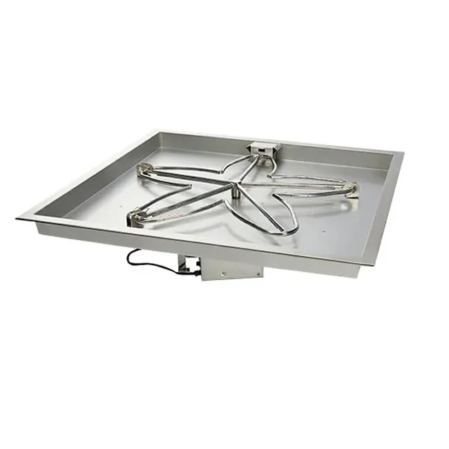 The 18" square bowl style fire pit insert is an excellent size for small outdoor areas. The square bowl style pan help with media retention and comes standard with a lip around the pan to support the fire pit burner inside the surround enclosure. It comes fully assembled with 65K BTU of flame power and ready to be dropped into your custom surround enclosure or existing masonry pit. All you will need is a gas line and and A/C power to bring your outdoor living space alive. If you need help sizing your pit or any other questions give us a call.