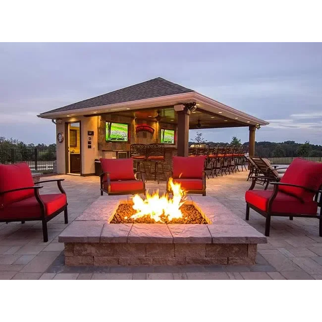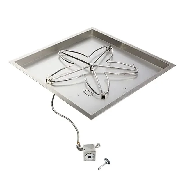 The square bowl style match lit fire pits comes in three different sizes, 18", 24" and 30" square. Made from solid 304 stainless steel to provide many years of enjoyment. Comes standard with the stainless steel bowl style burner pan, 36" whistle free flexible gas line from burner to control valve and Penta style burner with precision drilled holes unlike the competition as they punch their holes creating an inconsistent flame. The square bowl style pan is great for media retention and comes standard with a 1-3/8" lip around the pan to support the fire pit burner inside the surround enclosure.