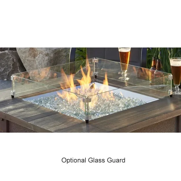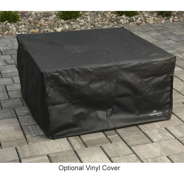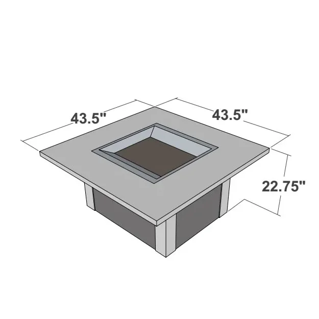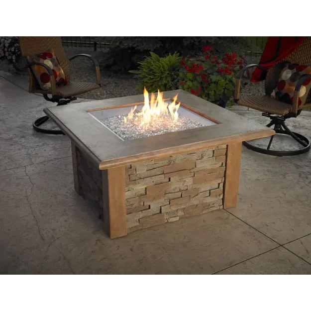 The Outdoor Greatroom Sierra fire pit table is made of outdoor rated faux stone with a durable Supercast mocha color top and comes complete with a 24" square fire pit insert, concealed controls and matching burner cover to convert the fire pit into a table when the fire pit is not in use. A regular 20 pound propane tank can be concealed under the fire pit and offers easy access with the built in door on the side of the enclosure.