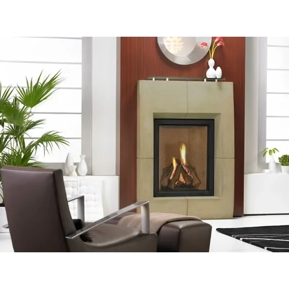 The European style ("taller than wide" opening) of the Hea-N-Glo Everest offers a fresh new look that's sure to add charm to any home. Its unique stacked campfire log set and distinctive refractory turns any room into a showpiece. It also features a clean face design that allows for a true masonry appearance. And, because it's a direct vent, it's easy to install and maintains your indoor air quality. Shown With Optional Stone Mantel Surround (Includes DF-EVEREST Standard Front)