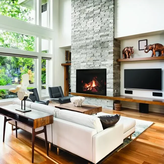 The included TruFlame intuitive remote controls the two burners, built-in accent lighting, and the optional dual blower system. The simple on-screen icons let you manually vary the flame height, interior accent light intensity and speed of blower speed if installed. You can select from two different thermostat modes – Conventional and Smart. In conventional mode the fireplace operates automatically on high to quickly warm your room to the desired temperature. In Smart mode the remote continuously compares the room temperature to the thermostat setting and then varies the burner flame height and speed of the dual blower to maintain the desired temperature with minimal variation.