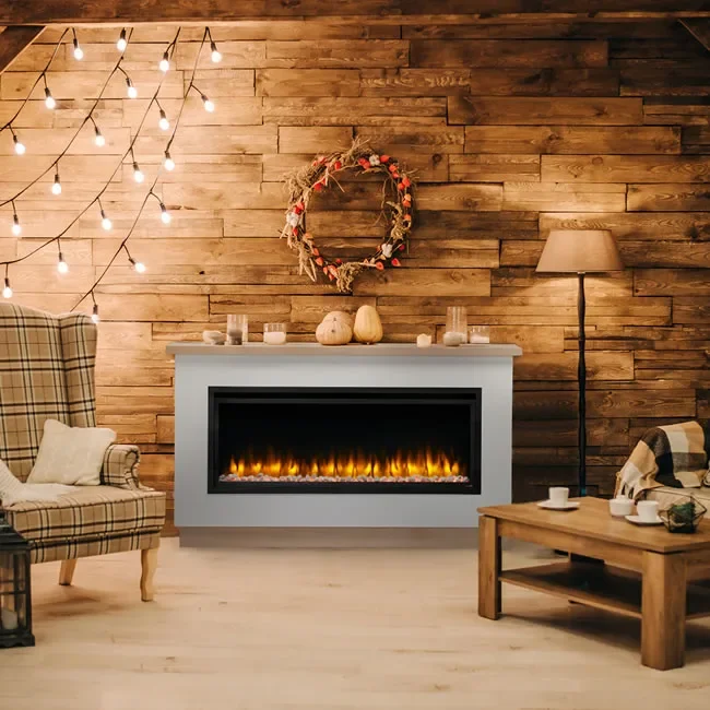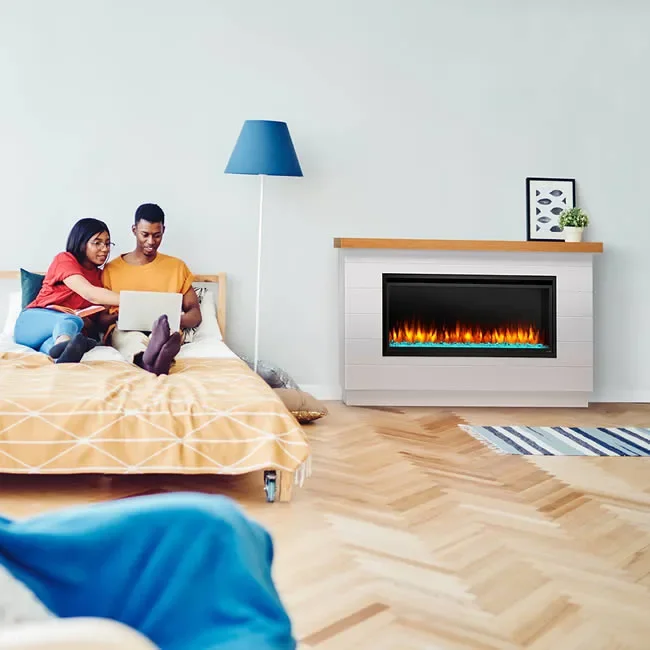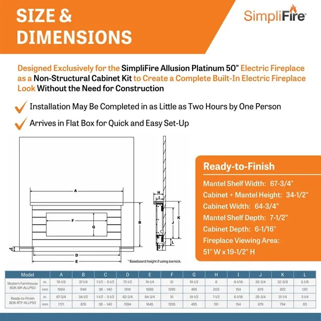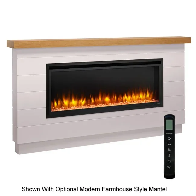 The 50-inch Allusion Platinum electric fireplace by SimpliFire can be wall mounted or fully recessed in to a wall. We also offer optional mantels in two different styles, the Farmhouse and Ready-To-Finish mantels are easy DIY installs. The Allusion Platinum fireplace is the easiest way to add a modern centerpiece to any living space.