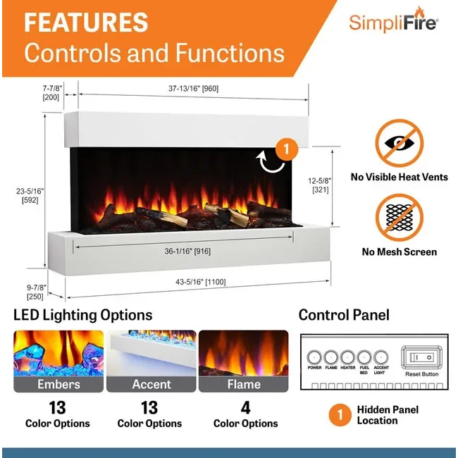 Looking for an easy to install wall mounted electric fireplace? Take a look at the 43-inch SimpliFire Format Format, this is the the easiest way to add a modern centerpiece to any room in the home or office. The minimalist floating-mantel design, fits your decor with multi-colored accent lighting to set the mood. Easy to install and comes with all the hardware needed.