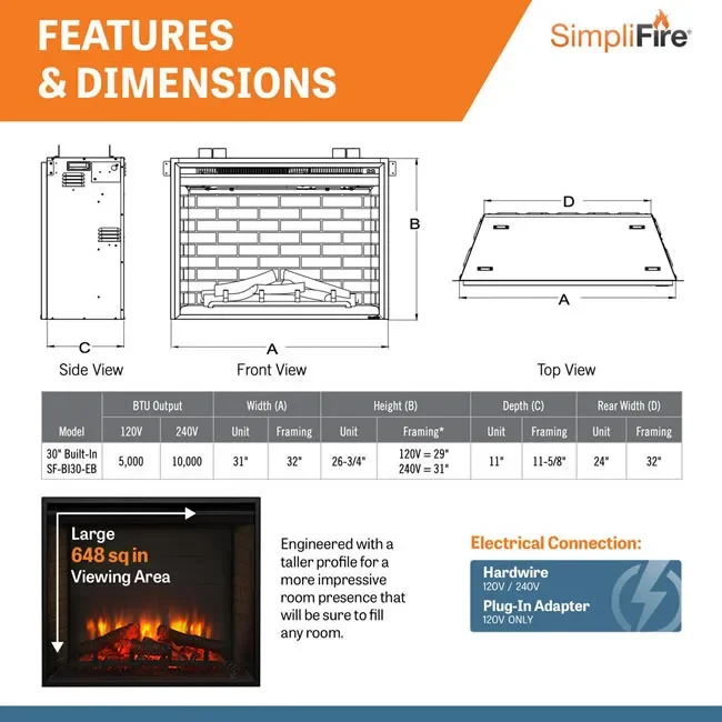 The 30" SimpliFire built-in electric fireplace by Monessen is an excellent choice for someone that want a fireplace without the mess. Being that its full size and has an appealing burn pattern your family and friends will think you have a cozy fire burning when they visit.