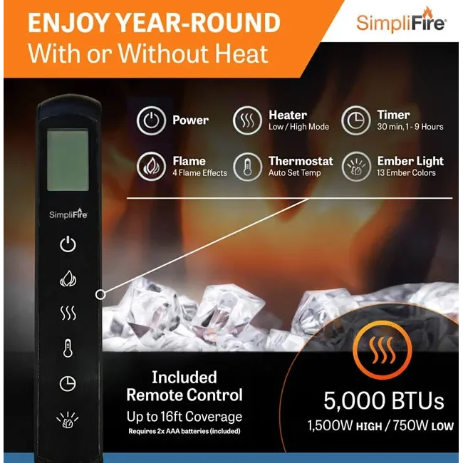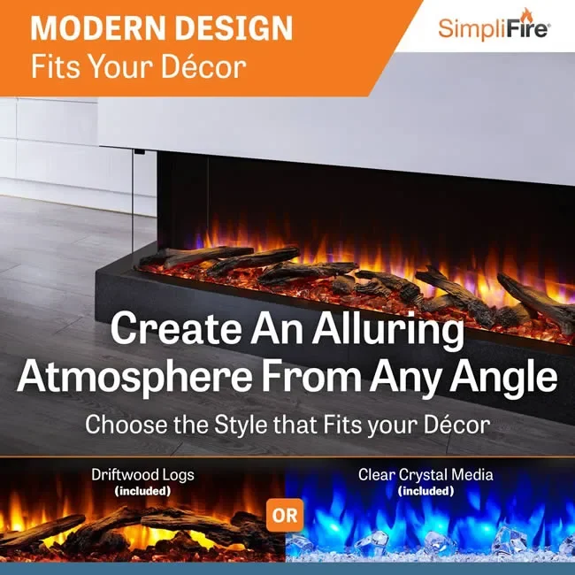 With the SimpliFire Scion Trinity 55-inch electric fireplace you can create an alluring atmosphere from any angle with unmatched ease and convenience. In three-sided, corner, or single-sided configurations, it adds stunning ambiance without the need for gas lines or venting.
