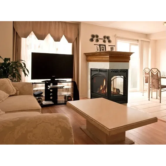 Our Pier provides three-sided viewing and works perfectly as a room divider or even the base of a bar. A beautiful look for year-round enjoyment, this unique gas fireplace includes standard metal refractory, a massive log set and glowing electric embers. Truly an elegant fire with plenty of efficient heat. With a large variety of fronts to choose from, the Pier can complement any decor and turn your room into a constant family space. Must Add Front For All Three Sides To Complete.