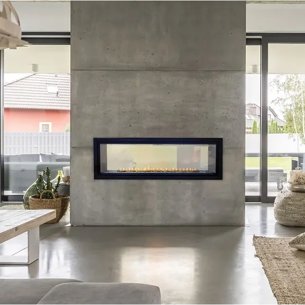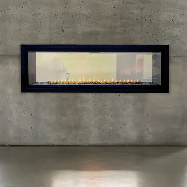 The Boulevard see-through 48" linear vent-free gas fireplace works well as a room divider and creates a contemporary focal point. The optional decorative trim fronts come in two different styles with a matte black finish for added design decor. The optional interior accent lighting is adjustable when wired to a rheostat to set the mood for year round use. Requires decorative gas media for inside the fireplace around the burner to ad that extra touch. The unit standard with electronic ignition that will ignite the pilot light and adjust the flame all from the included remote control.