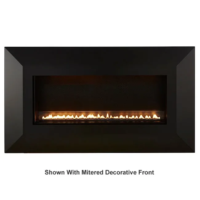 The mitered decorative front includes the required fireplace wrap when surface mounting or partially recessing into a wall.