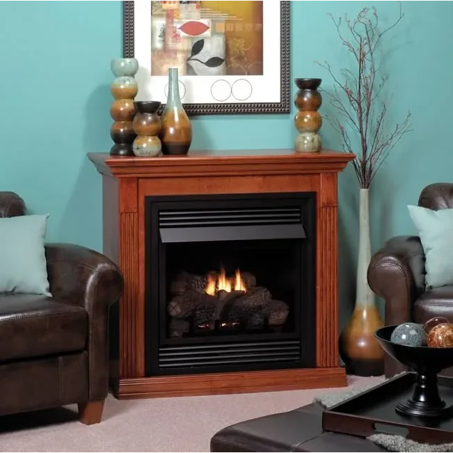 This medium size vent-free fireplace system will fit in almost any room. Comes complete with firebox, burner, gas logs and mantel with four different finish choices shown below. Also available is an optional interior brick liner if desired or you can used the fireplace as it comes with a flat black interior. This unit also includes flat black slat louvers, flat black outer frame trim kit and black hood. Also available in hammered pewter finish.