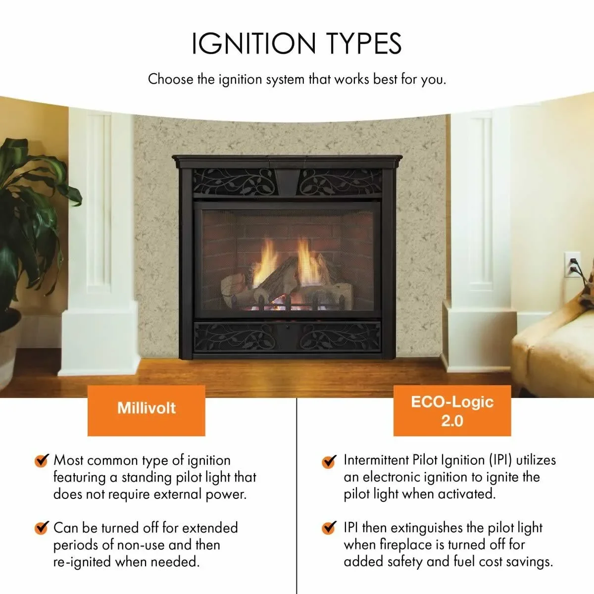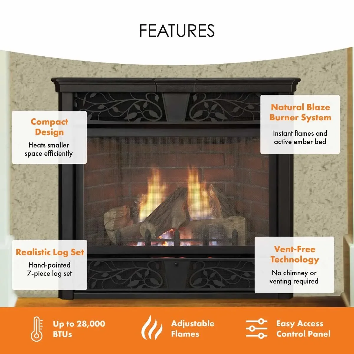 The Monessen Symphony 32 inch vent-free gas fireplace system provides outstanding design flexibility. Combined with its high heating efficiency, the Symphony series provides warm, comfortable supplemental heat without the hassles of wood, but with the realism of a traditional fireplace.