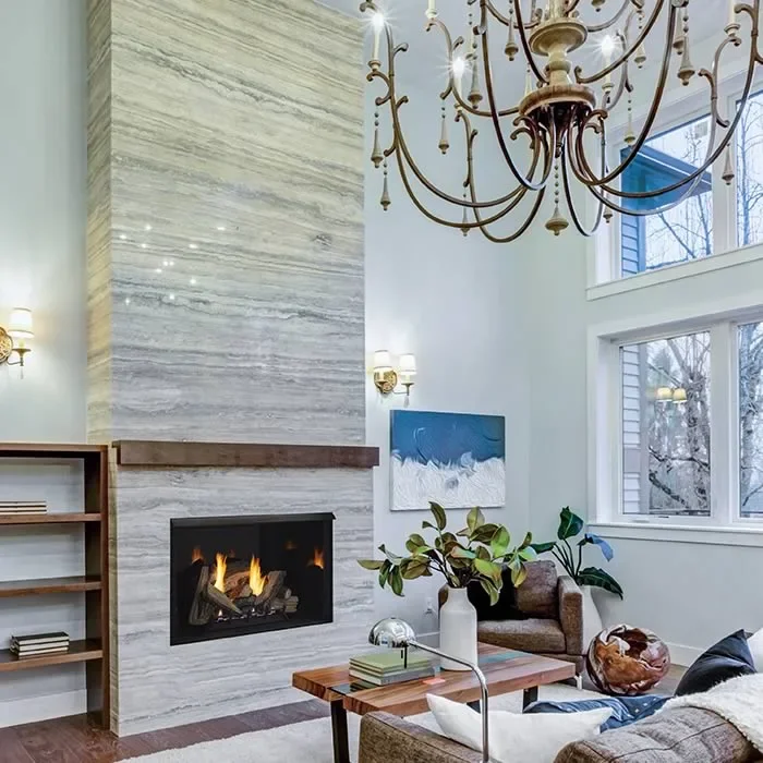 The circulating firebox has a radiant clean face with the option to add a blower kit. The clean flush face can have a non-combustible facade like rock tile or marble overlap the metal of the fireplace giving it that real masonry look.