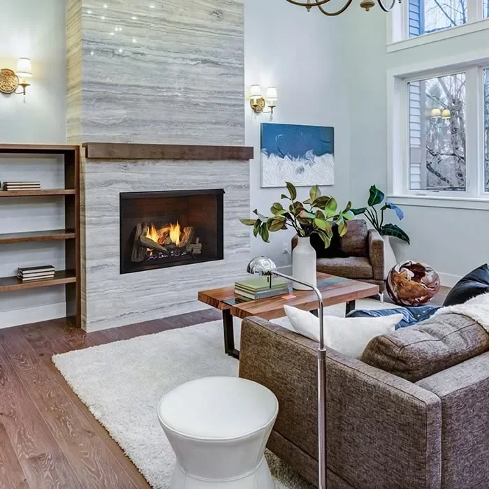 The circulating firebox has a radiant clean face with the option to add a blower kit. The clean flush face can have a non-combustible facade like rock tile or marble overlap the metal of the fireplace giving it that real masonry look.