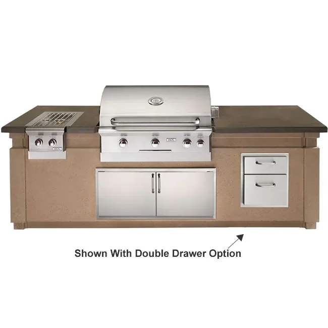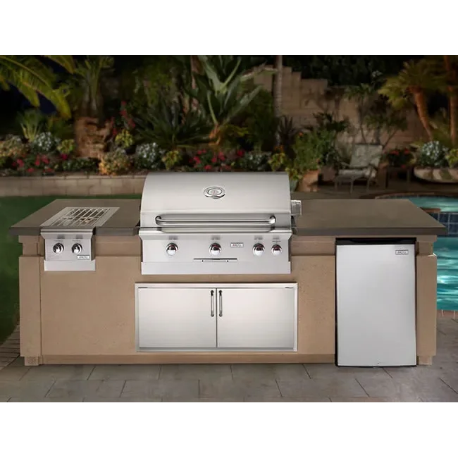 This all-inclusive outdoor kitchen island package from American Outdoor Grill features a built-in 36" American Outdoor Grill gas grill that can be installed into the 107" long X 36" deep glass fiber reinforced concrete cabinet with a built-in double side burner, 4.0 cubic foot refrigerator or double storage drawers, echelon style double access stainless steel storage doors below the grill and single access door on the left end of the island. Don't worry about wasting your precious grilling time trying to put this outdoor kitchen together! This island is easy to assemble by simple connecting the concrete panels with only 6 bolts that are provided with the package.