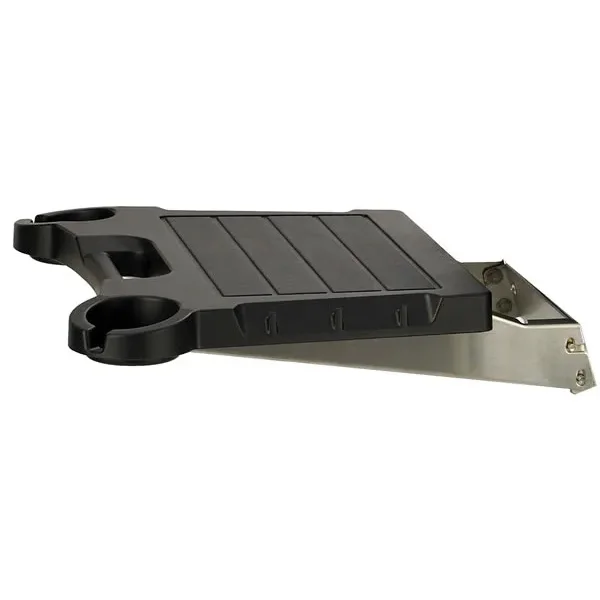 Black solid surface with cup holders mounted with a drop-down stainless steel bracket.