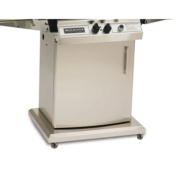 This portable Broilmaster stainless steel grill cart features an operable door in the front for storage or a propane take. Comes with casters for move ability.