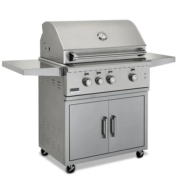 The 34" Broilmaster portable cart grill is our most popular size. We have taken key features from other top performing grill brands and rolled them all into one perfect outdoor grill. Starting with the most important part of any grill we added 3 commercial grade 304 cast stainless steel bow tie style burners. Then the second most important, heavy-duty stainless steel rod cooking grids for maximizing durability. Then comes our most dependable push-and-turn flame thrower ignition system that delivers a fast start every time. The illumination system compliments its unmistakable style giving an appearance to catch every admiring eye.