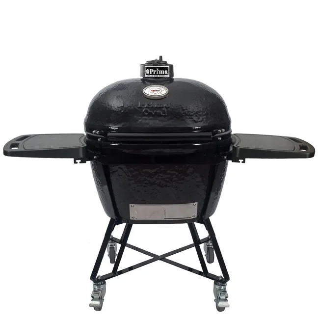 The most popular Primo Grill is the Oval XL All-In-One package that comes complete with the oval shaped Kamado style ceramic grill, new ergonomic handle, portable cradle stand with casters, FDA approved food safe side tables, ash tool and grate lifter. Features also include a cast iron top vent, easy-to-read thermometer, porcelain coated cooking grate and a stainless steel lower draft door.