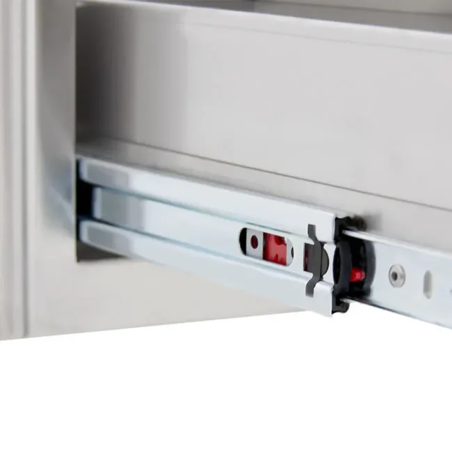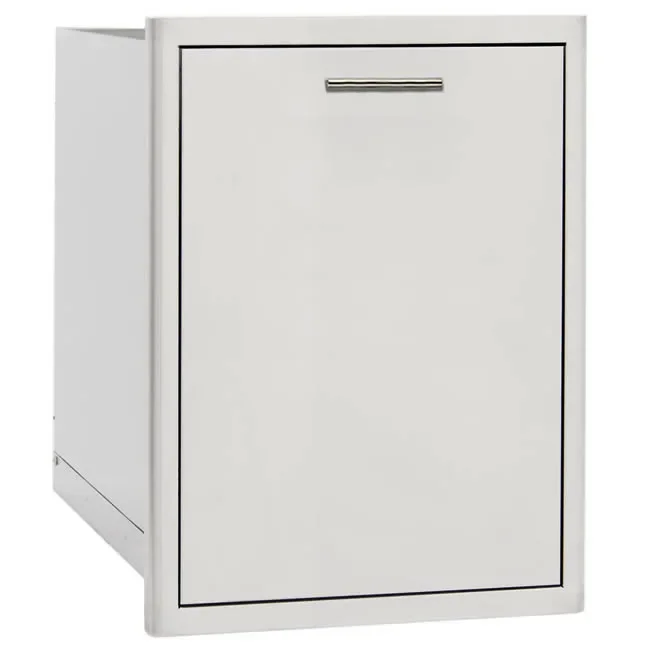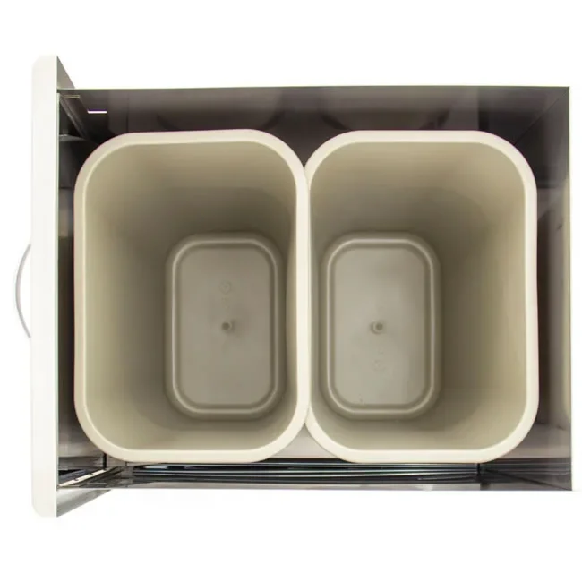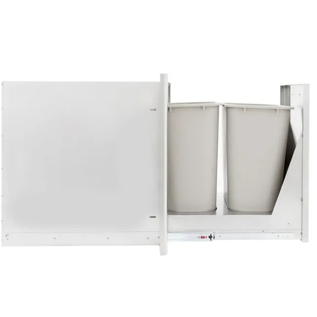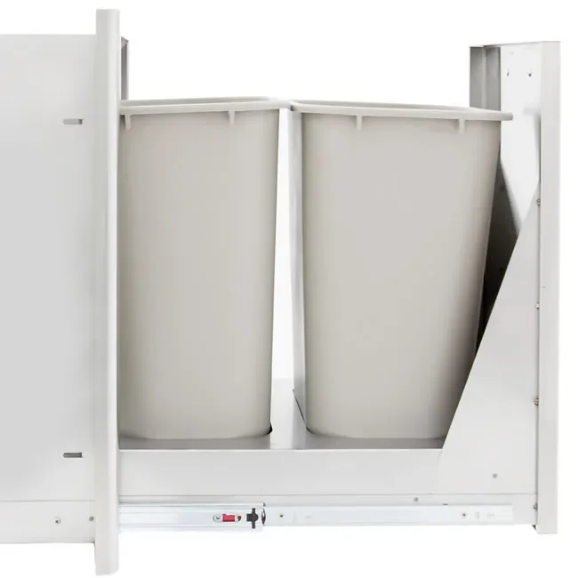 This built-in roll-out double trash can drawer can be used for separating trash from recyclable products and makes for a convenient way to dispose of trash in any outdoor living area.