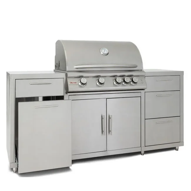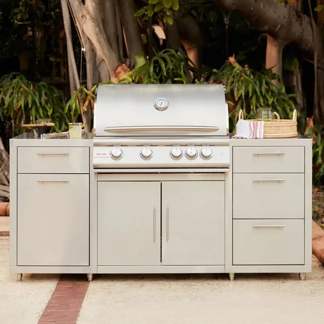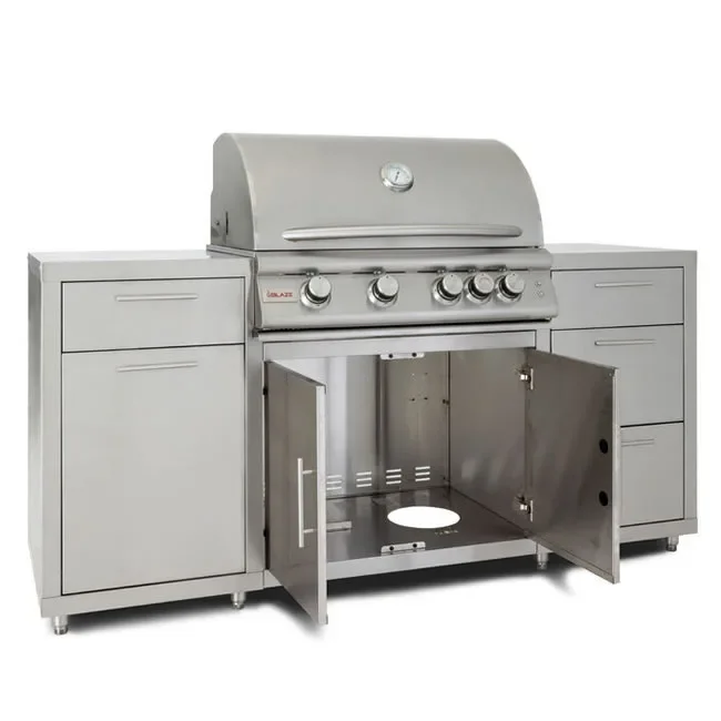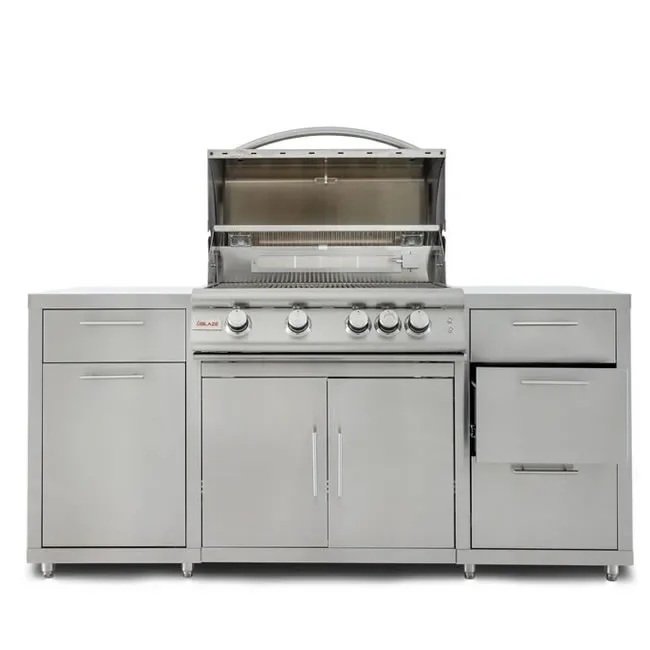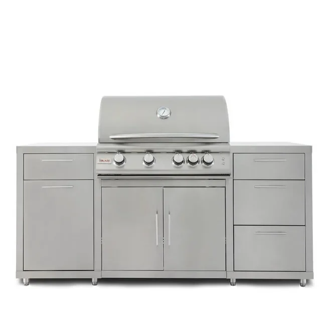 The Blaze stainless steel island package comes with the popular 32" 4-burner LTE+ built-in grill, 2 small drawers and 2 large drawers and a pull-out trash bin. The Blaze Island is light enough for two people to easily install and set up.