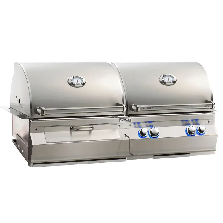 The Aurora A830i Dual Fuel Gas / Charcoal Combo Grill with a rotisserie combines the best of both for outdoor cooking. The accurate grilling and ease of use comes with A430i gas grill and is unmatched with the flavor and tenderness of a companion charcoal grill.