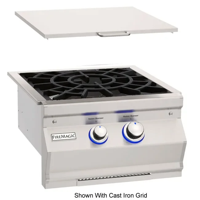 Our Fire Magic Aurora series double side burner features independently controlled 15K BTU burners that can be adjusted from high to low for precise heat control. You have a choice between a stainless steel rod or cast iron grids that covers the burner and supports the pots and pans over the fire.
