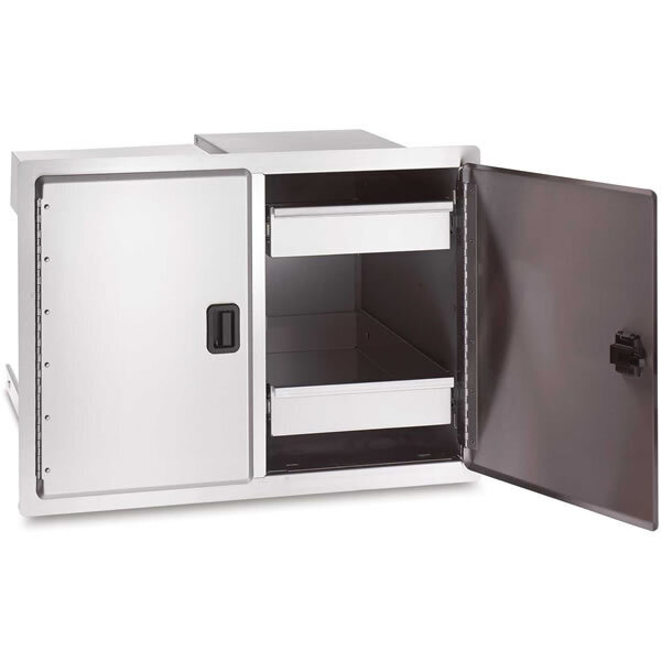 Fire Magic stainless steel Legacy series double access doors with tank holder one the left side and storage trays / drawers on the right side for outdoor kitchen island staorage. Brick-In Dimensions: 30-1/2" Wide X 21" High X 20-1/2" Deep