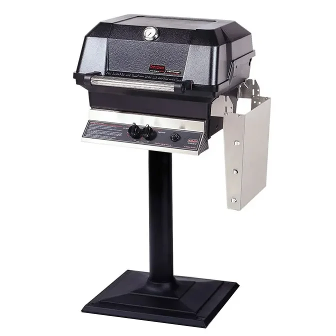 This propane gas MHP JNR series patio post mount grill comes standard with a no-rust anodized aluminum permanent mount patio post and base. A perfect grill to mount on the deck or any other hard surface. Comes standard with a fold down stainless steel side shelf with built-in utensil holders.