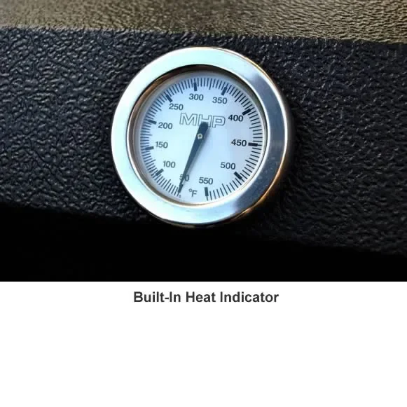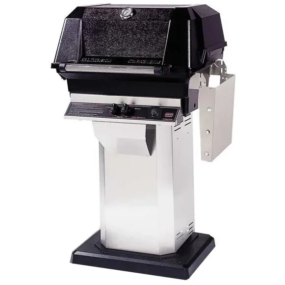 This natural gas MHP JNR series permanent pedestal mount gas grill comes standard with a stainless steel column and heavy cast aluminum base with one stainless steel drop down side shelf.