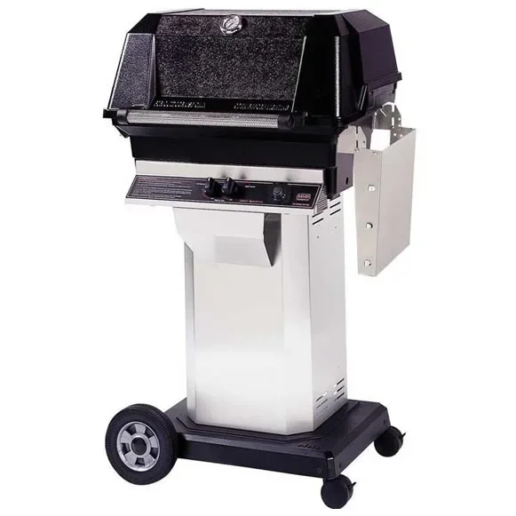 This JNR series portable natural gas grill comes standard with a stainless steel column and a two wheel portable heavy cast aluminum base with one drop down stainless steel side shelf.
