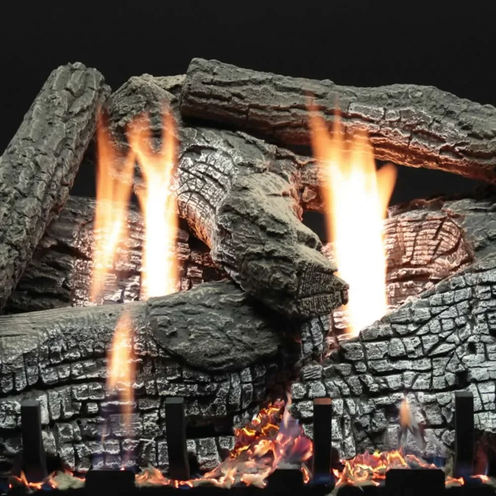 The 18" Super Stacked Wildwood log set by Empire comes equipped with electronic ignition and variable flame height remote control that has a built-in digital thermostat. You enjoy twice the beauty using half the fuel. We've also concealed the controls for more appeal. The Slope Glaze Ember Bed Burner System and Wildwood log set introduces the next generation of comfort and the most lively flames available.