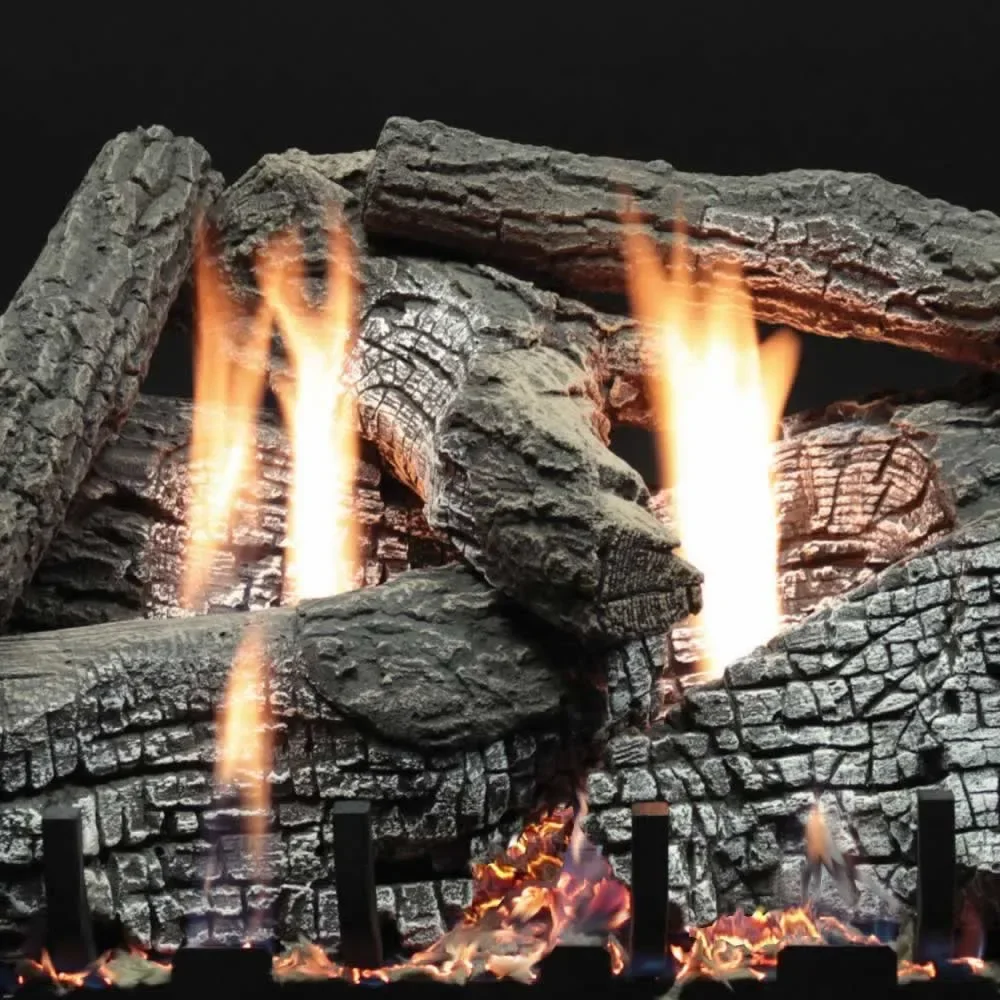 The 24" Super Stacked Wildwood log set by Empire comes equipped with electronic ignition and variable flame height remote control that has a built-in digital thermostat. You enjoy twice the beauty using half the fuel. We've also concealed the controls for more appeal. The Slope Glaze Ember Bed Burner System and Wildwood log set introduces the next generation of comfort and the most lively flames available.