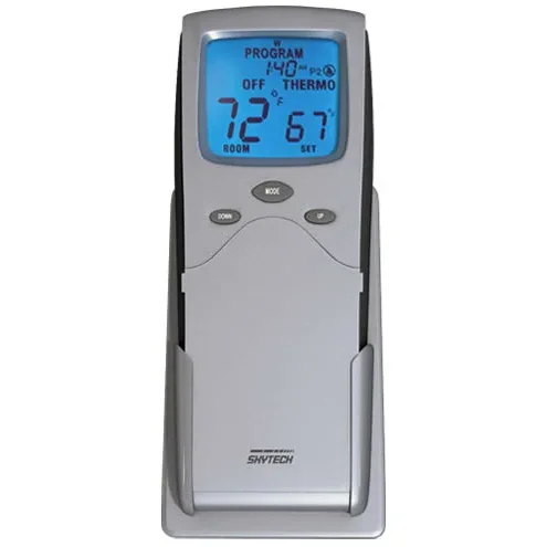 The Skytech 3301 P2 programmable remote control offers built in factory programs that allow you to set a specific time and day to turn your gas logs or fireplace on and off. This remote can be used with gas logs for fireplaces that are remote ready or have a millivolt control valve. This remote also has a built in thermostat allowing you to maintain a set temperature. This unit uses radio frequencies to communicate with the receiver so it does not have to be pointing directly at the fireplace to work. Replaces model 3301P.