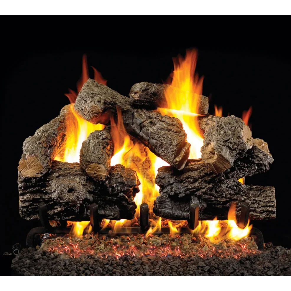 The Real Fyre 18" Charred Royal English Oak vented gas log set is made from superior refractory ceramics that ensure the logs retain their strength at high temperatures. The G45 burner system burns efficiently while protecting natural resources and reducing pollution. The high definition bark and natural colors create an authentic wood look. Enjoy radiant heat while in operation and after set has been turned off. We also offer Vented Gas Log Accessories to enhance the look of your fireplace.