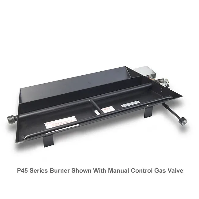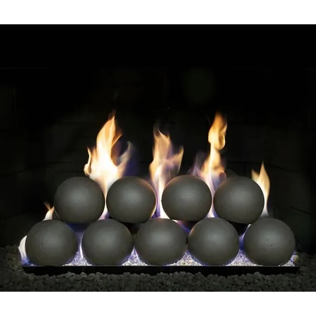 The 18" set of Real Fyre by RH Peterson Fyre Spheres sometimes called cannonballs provide a contemporary alternative to traditional gas logs. This set come complete with our P45 series dual pan burner system which creates a dynamic flame pattern enveloping the fyre spheres. Comes standard with a manual control gas valve that will allow you to turn the flames up and down or can be up graded to a variable flame height control valve that comes with a remote control to raise and lower the flame as well as turn the fire on and off.