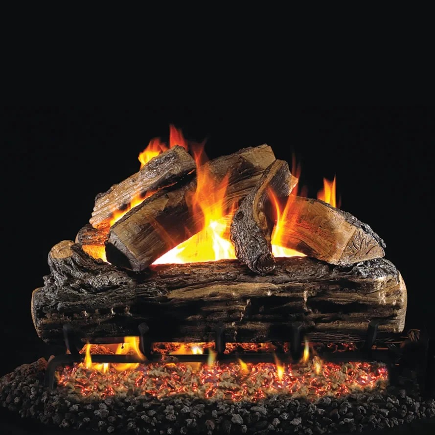 The Real Fyre 24" Split Oak vented gas log set is made from superior refractory ceramics that ensure the logs retain their strength at high temperatures. The G45 burner system burns efficiently while protecting natural resources and reducing pollution. The high definition split bark and natural colors create an authentic wood look. Enjoy radiant heat while in operation and after set has been turned off. We also offer Vented Gas Log Accessories to enhance the look of your fireplace.