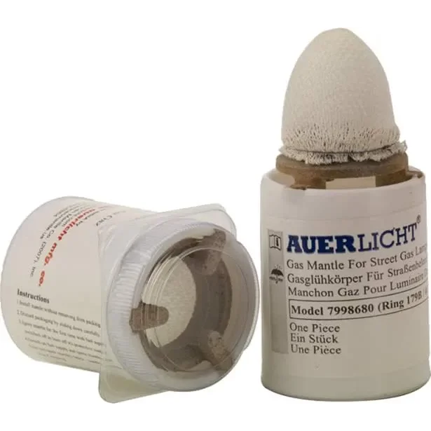 1 preformed hard mantle made from synthetic thread with a #2 size porcelain ring. Can be used with most any residential outdoor gas light that has an inverted burner. Sold individually.