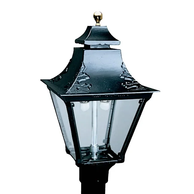 This is a swag top 4-sided gas light head made of cast aluminum providing greater strength, durability and finish quality. Finishes are baked on heat resistant powder coat paint. Provides a superior lamp finish and enables it to withstand the harsh weather. Fits 3 inch diameter gas lamp post. Available with open flame burner or traditional dual inverted burner with mantles.