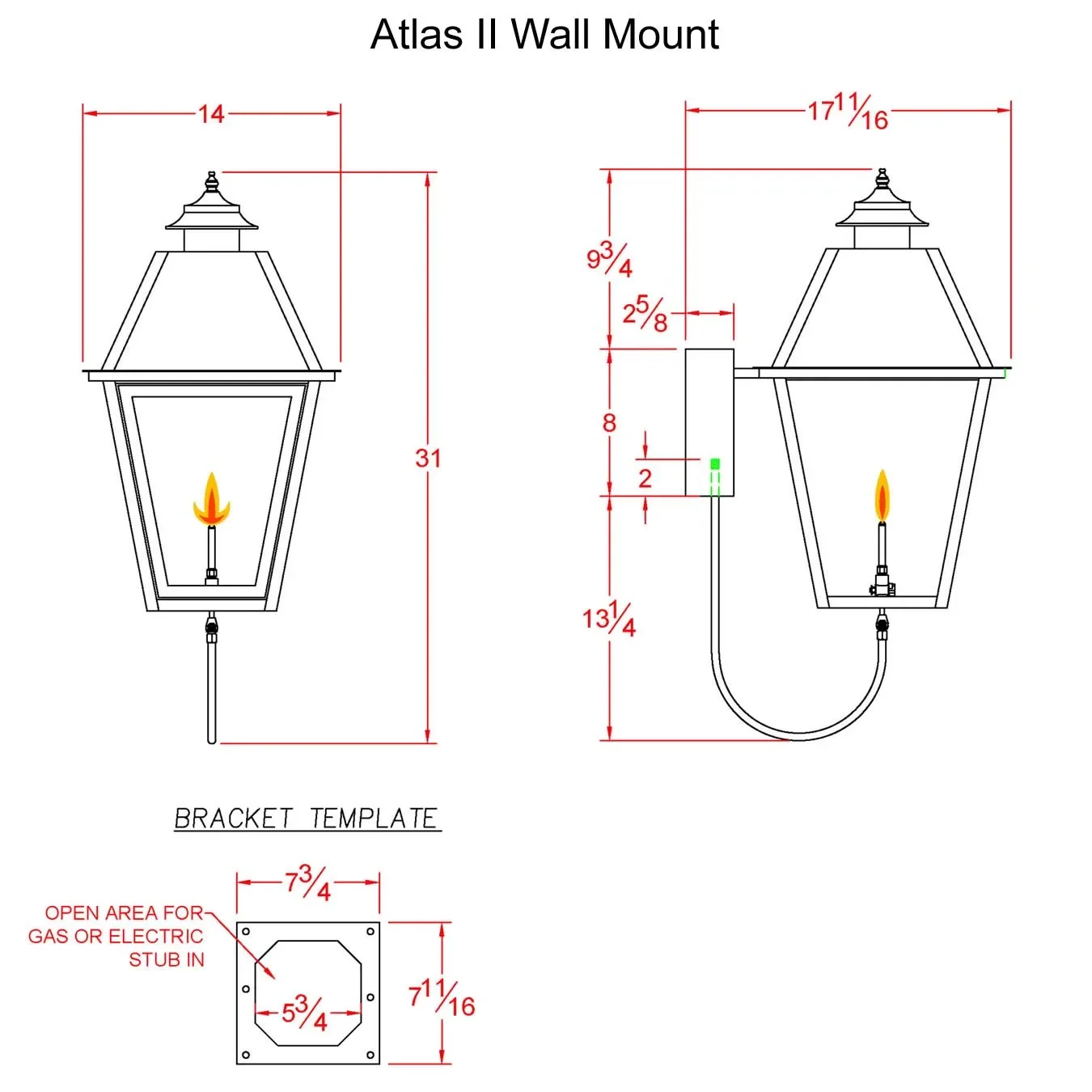 The Atlas II is a medium size handcrafted all cooper wall mount gas lamp made in the USA by Legendary Lighting. Offered in match lit or electronic ignition open flame burner models for convenience and savings.