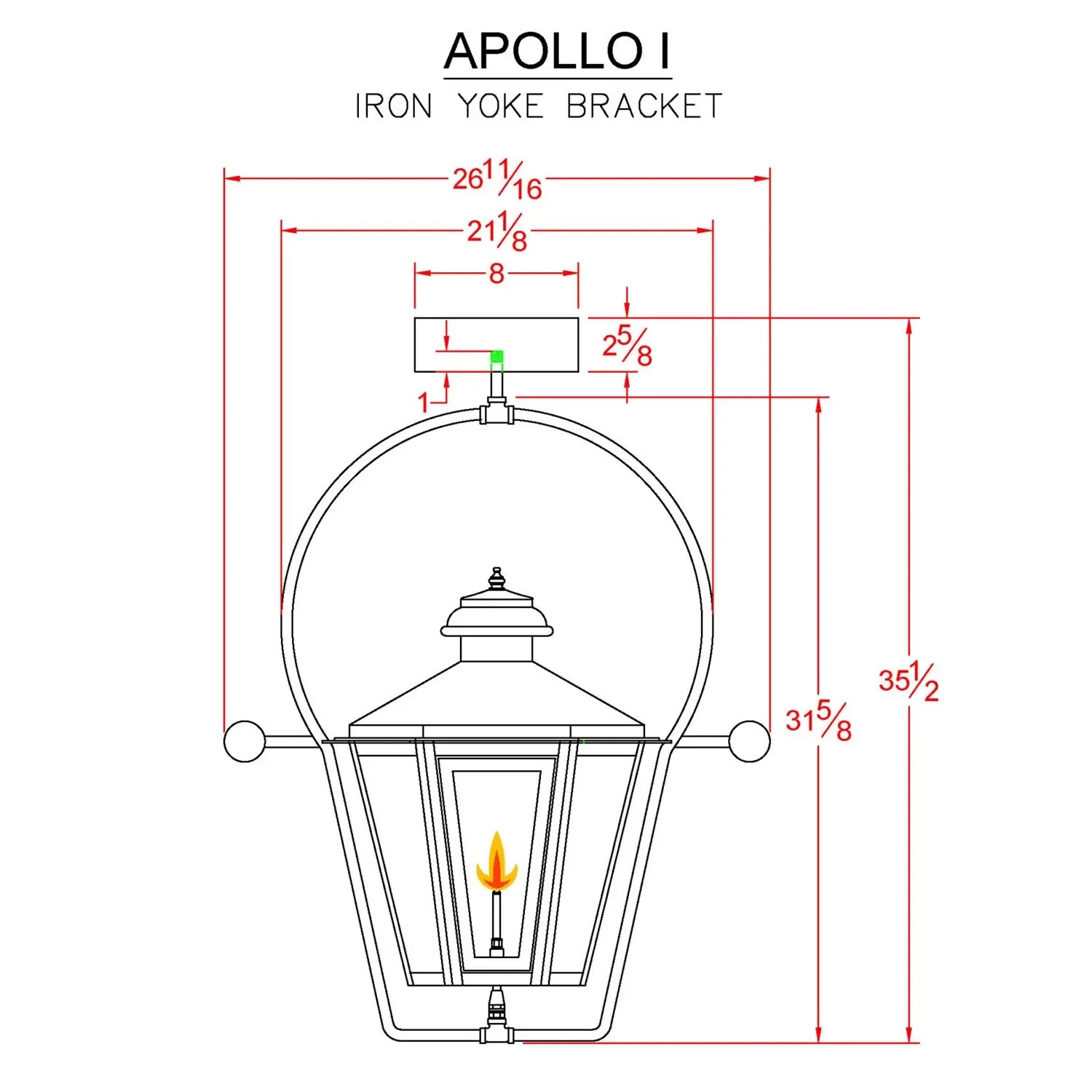 The Apollo I series Yoke mount is our second most popular cooper gas lamp, handcrafted and made in the USA by Legendary Lighting. Offered in match lit or electronic ignition, both come with our solid brass signature maple leaf pattern open flame burner.