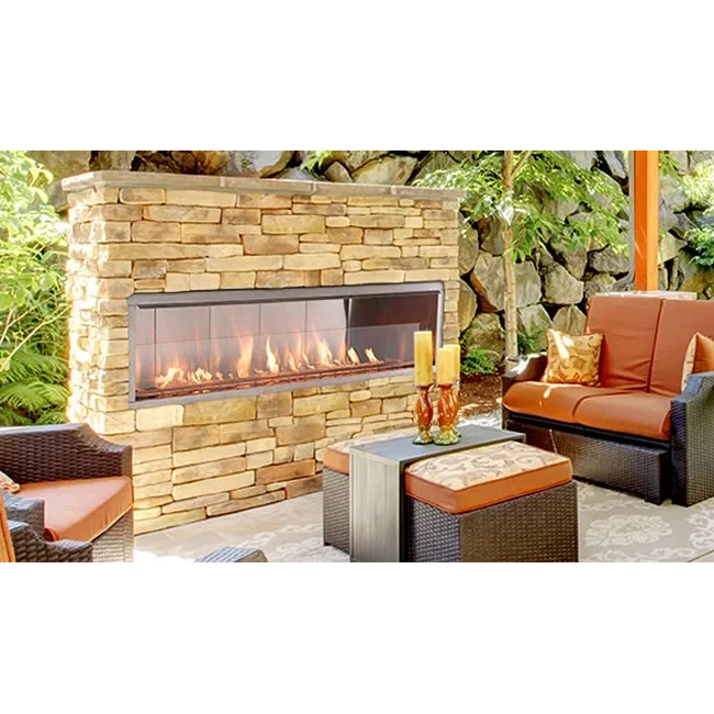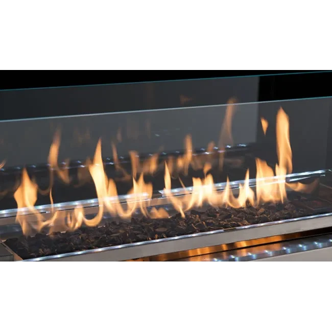 The Superior 48" linear outdoor fireplace can be installed as a single sided or two-sided see through. Unit ships in a single-sided configuration with optional see-through conversion kit. Comes standard with a wall-mounted control box that allows control of flames and interior lights. Constructed from stainless steel for long-lasting outdoor use.